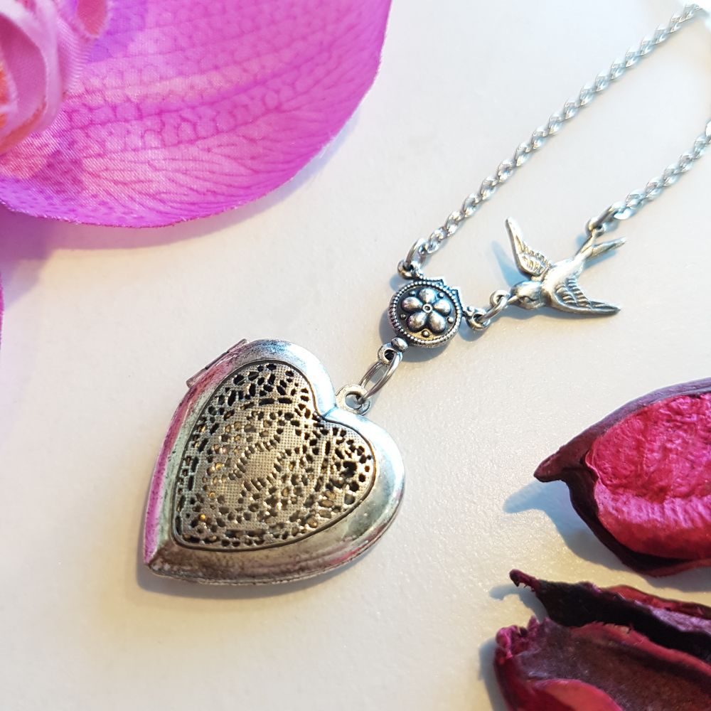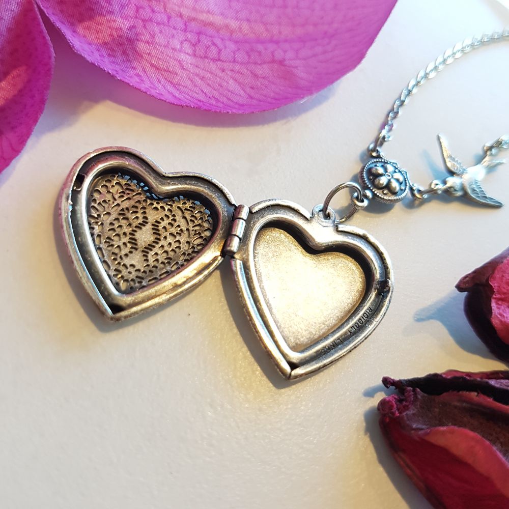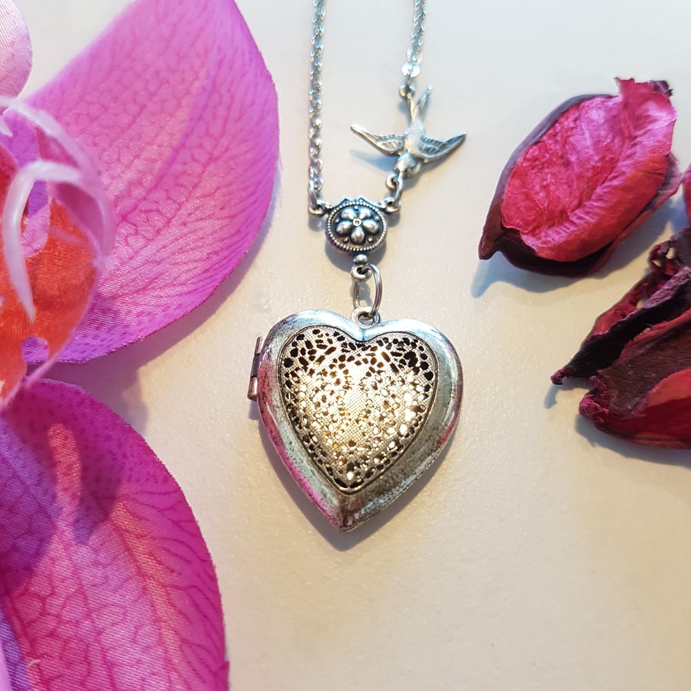قلادة على شكل قلب مزخرفة بنقش مميز ومطلية بالفضة. بداخل القلادة مساحة مخصصة لإضافة صورتين من صورك المفضلة. تصلح كهدية لمختلف المناسبات المميزة.