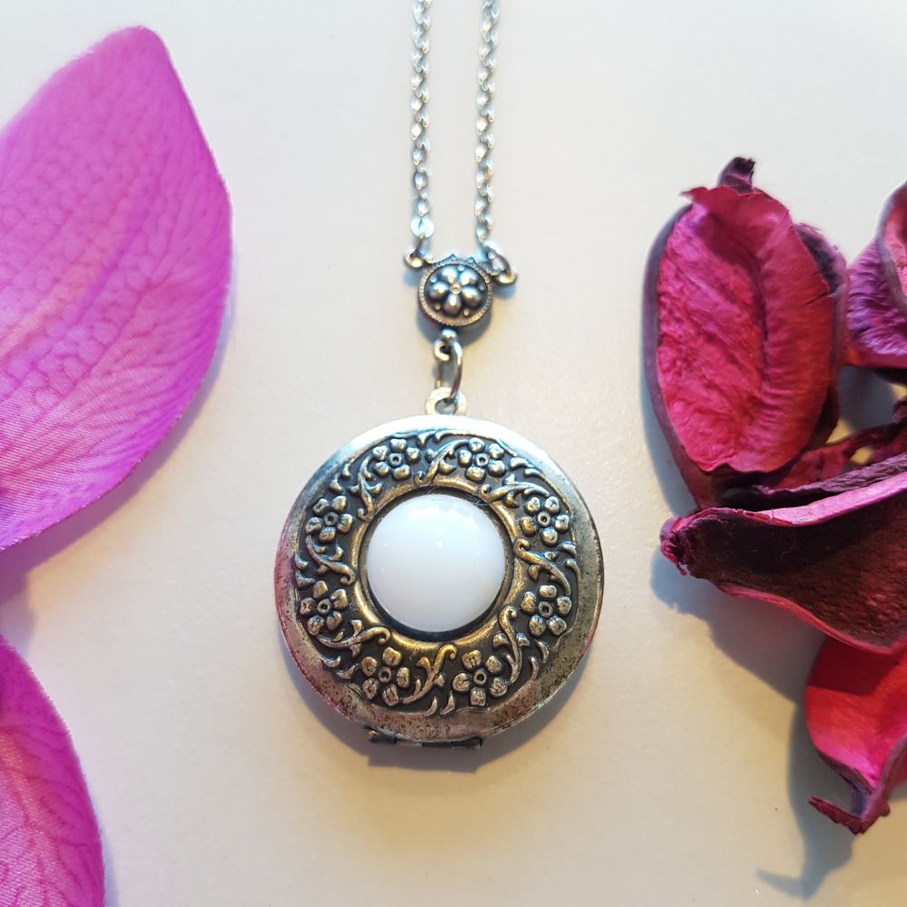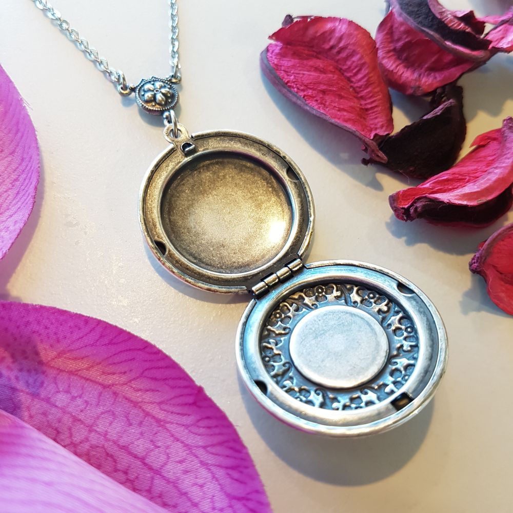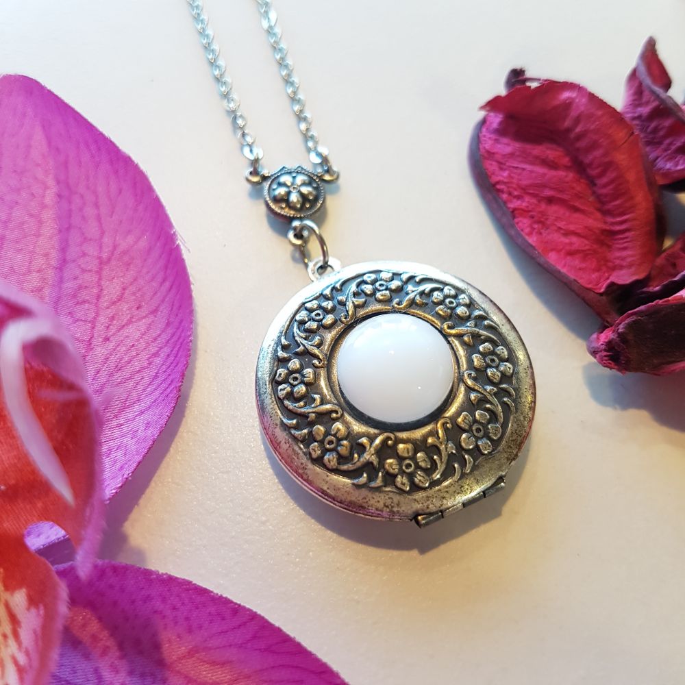 قلادة بنقش مميز ومطلية بالفضة مع حجر لؤلؤ براق في الوسط. بداخل القلادة مساحة مخصصة لإضافة صورتين من صورك المفضلة. تصلح كهدية لمختلف المناسبات المميزة.