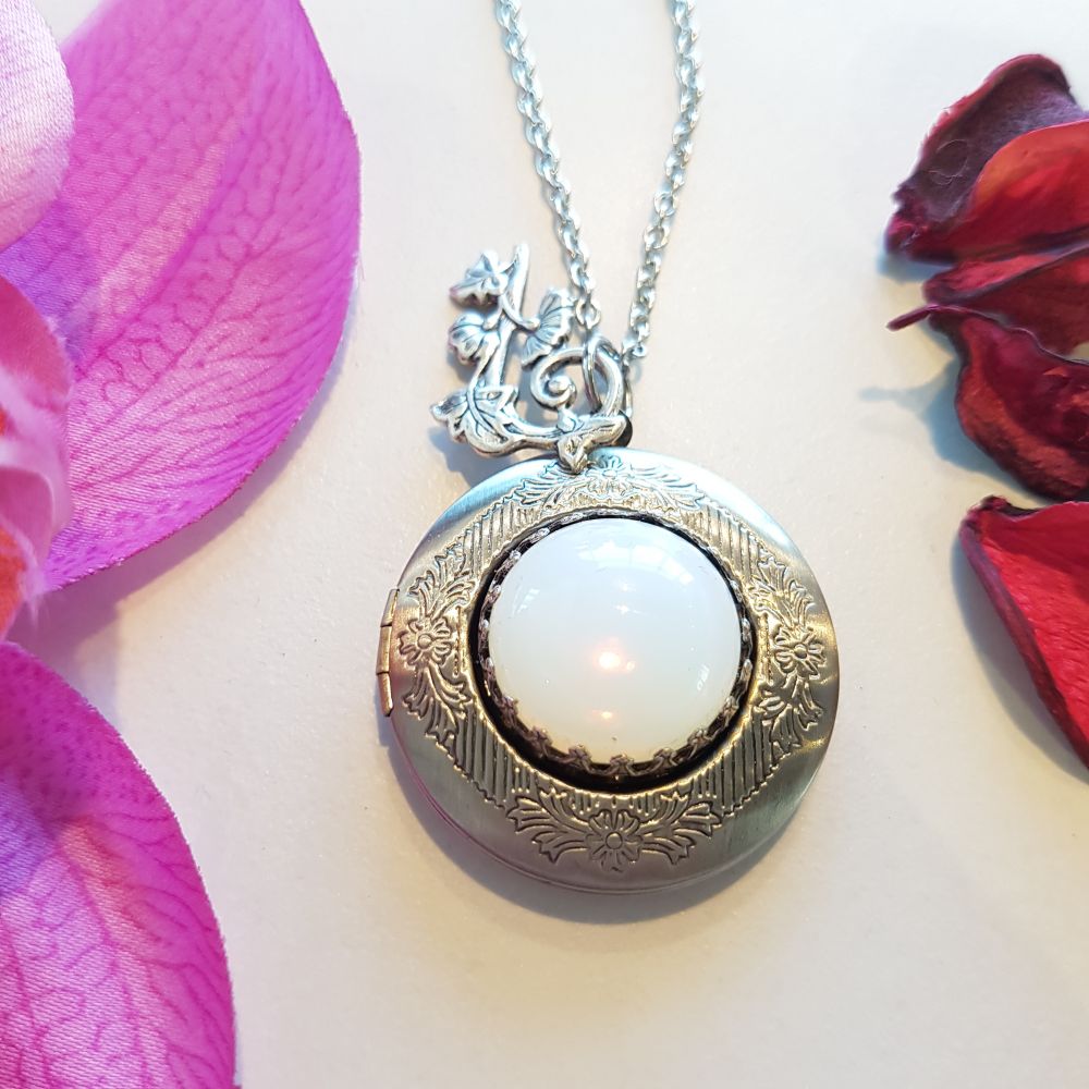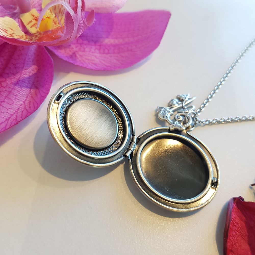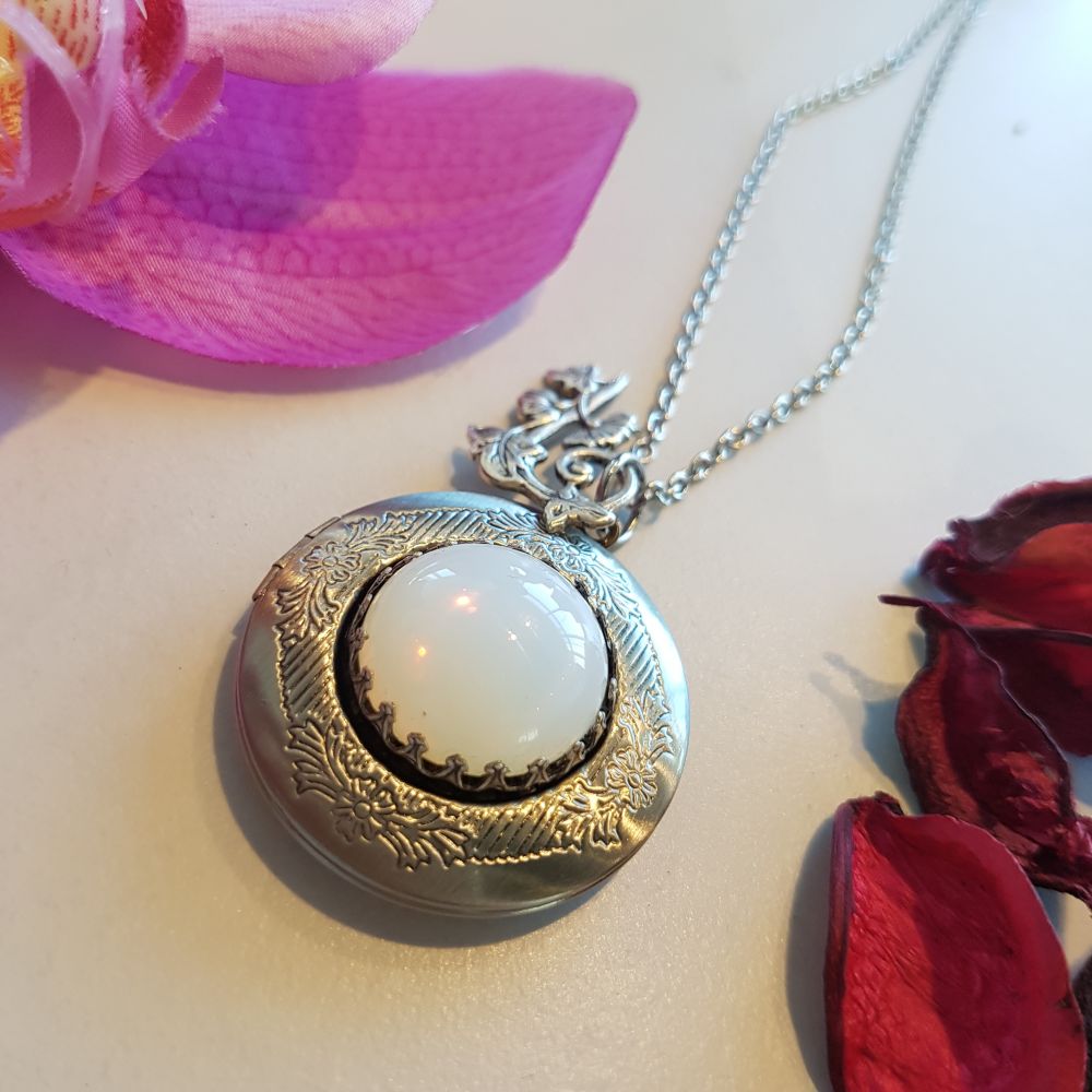 قلادة بنقش مميز ومطلية بالفضة مع حجر أبيض براق في الوسط. بداخل القلادة مساحة مخصصة لإضافة صورتين من صورك المفضلة. تصلح كهدية لمختلف المناسبات المميزة.