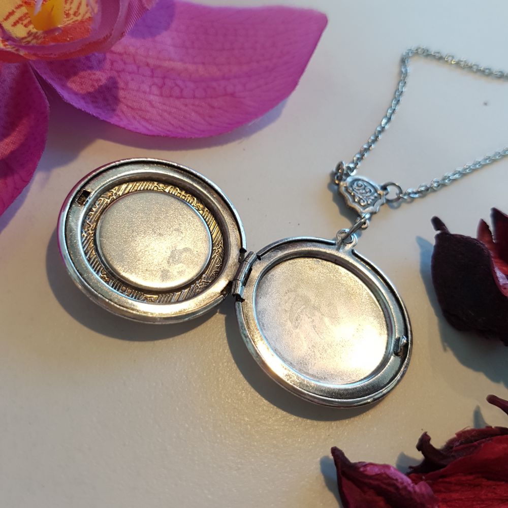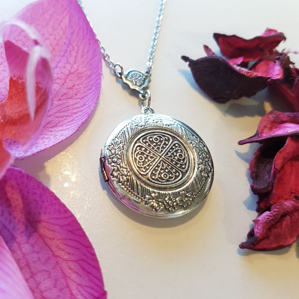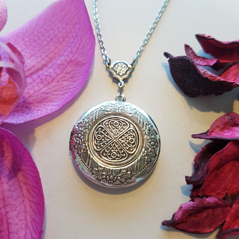 قلادة مزخرفة بنقش مميز ومطلية بالفضة المعتقة. بداخل القلادة مساحة مخصصة لإضافة صورتين من صورك المفضلة. تصلح كهدية لمختلف المناسبات المميزة.