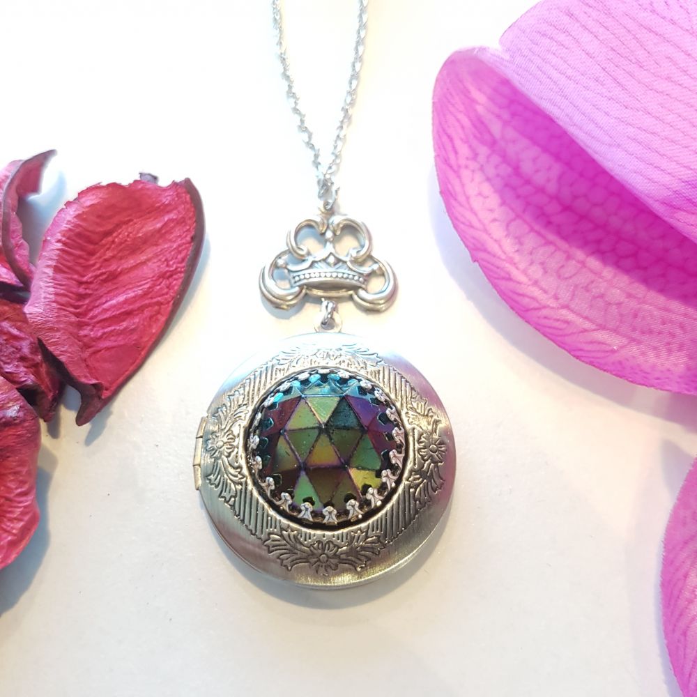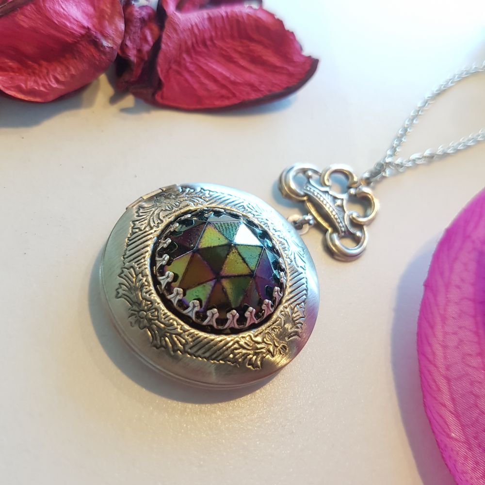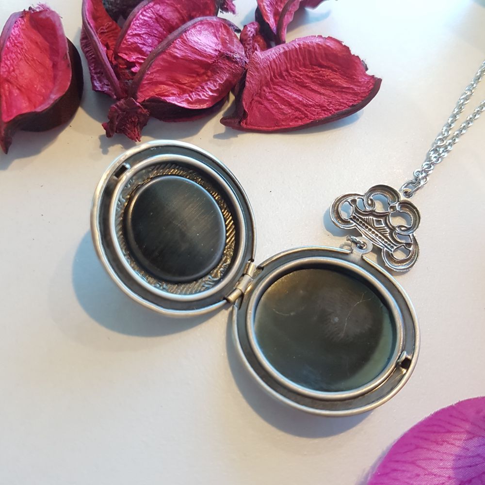 The locket opens up left to right with room inside to hold photos, a secret message or small treasures.
