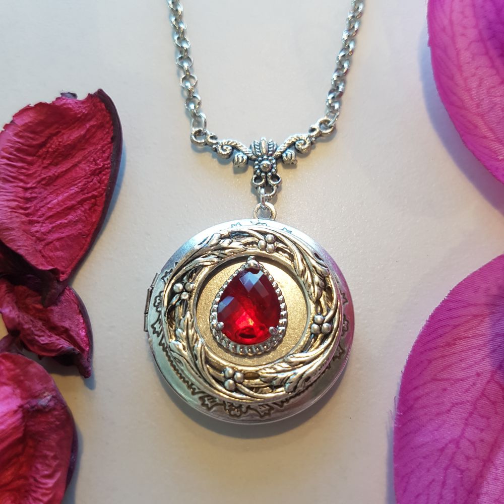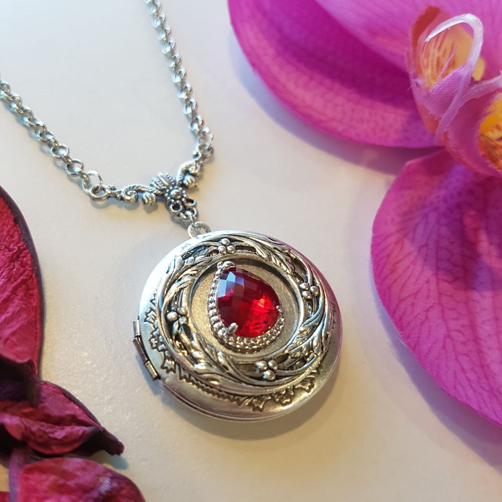 قلادة بنقش مميز ومطلية بالفضة مع حجر أجمر براق في الوسط. بداخل القلادة مساحة مخصصة لإضافة صورتين من صورك المفضلة. تصلح كهدية لمختلف المناسبات المميزة.