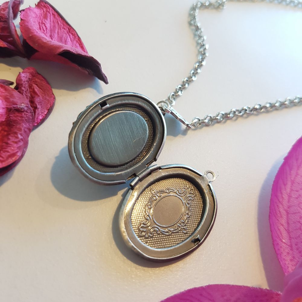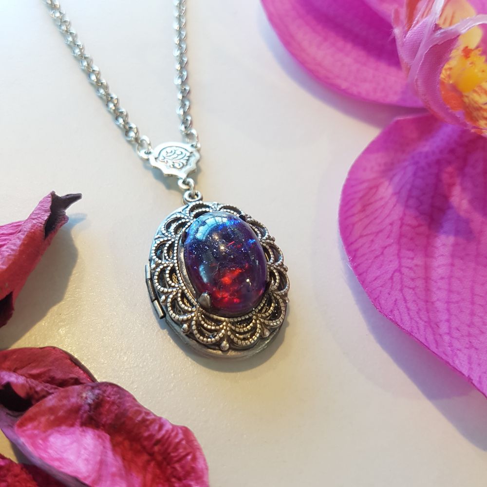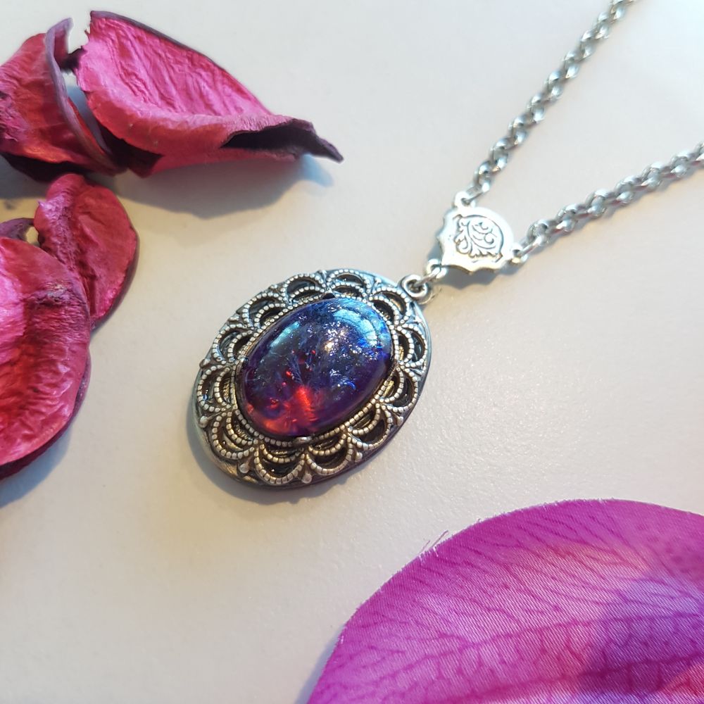 قلادة بنقش مميز ومطلية بالفضة مع حجر الأوبال البراق بألوان المجرات في الوسط. بداخل القلادة مساحة مخصصة لإضافة صورتين من صورك المفضلة. تصلح كهدية لمختلف المناسبات المميزة.