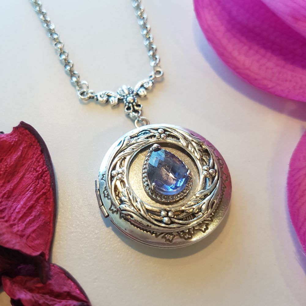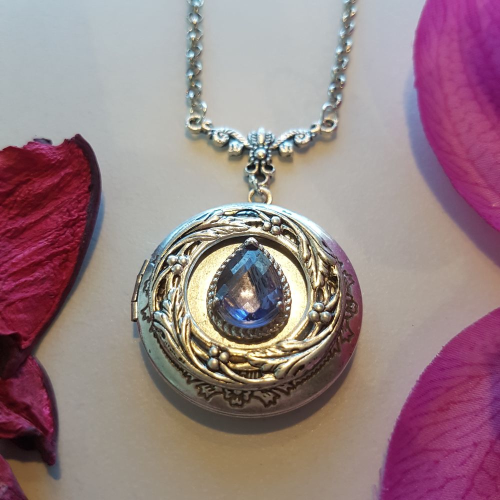 Lavender purple Victorian Steampunk Locket is 24 inches long. Feminine antique silver locket is decorated with Victorian style antique silver floral frame. We have set Swarovski stone in the middle of locket which is set in silver setting. Pendant is hanging from a antique silver leafy rosary link. Necklace is finished with antique silver chain and antique silver floral toggle clasp.