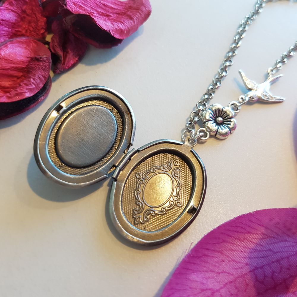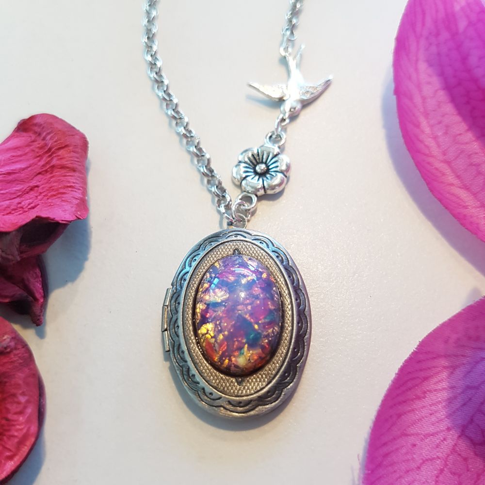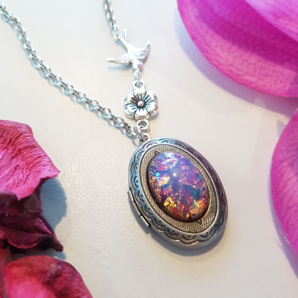 قلادة بنقش مميز ومطلية بالفضة مع حجر الأوبال البراق بألوان مبهرة في الوسط. بداخل القلادة مساحة مخصصة لإضافة صورتين من صورك المفضلة. تصلح كهدية لمختلف المناسبات المميزة.