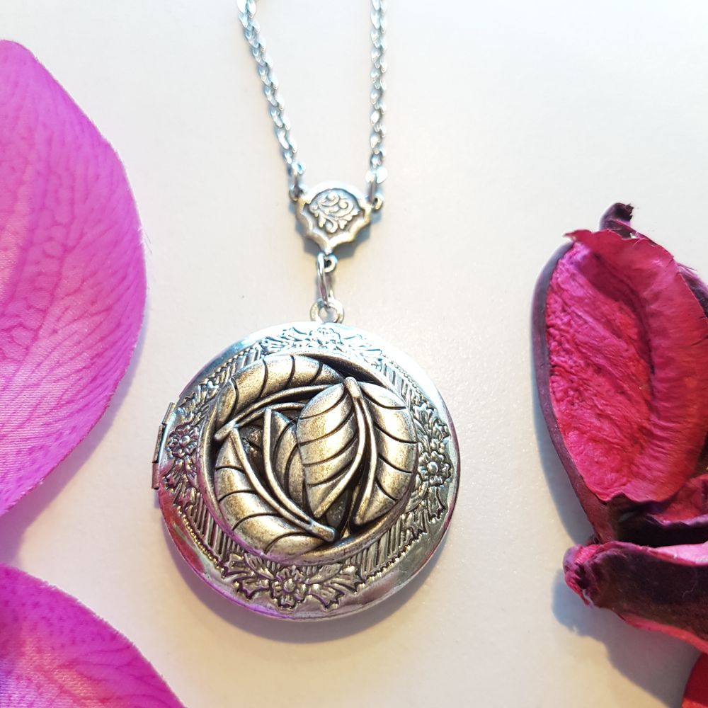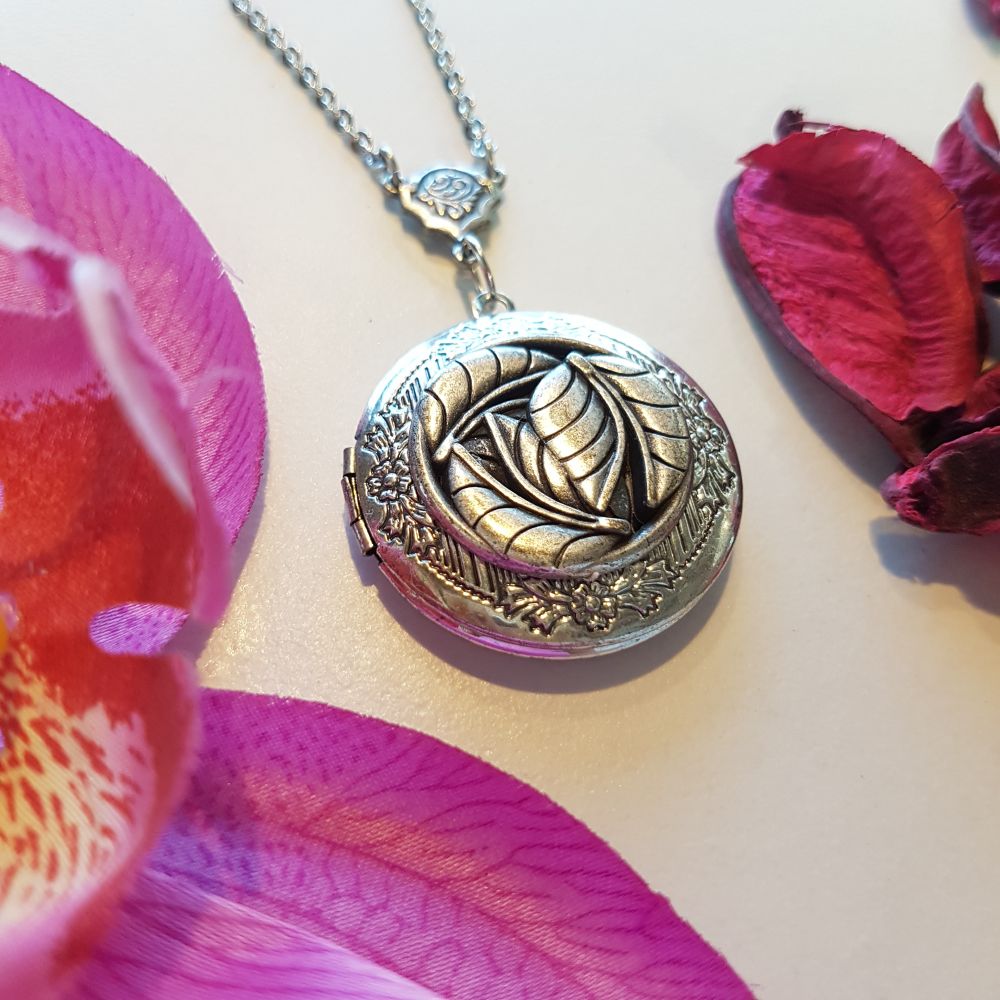 قلادة مزخرفة بنقش مميز ومطلية بالفضة المعتقة. بداخل القلادة مساحة مخصصة لإضافة صورتين من صورك المفضلة. تصلح كهدية لمختلف المناسبات المميزة.