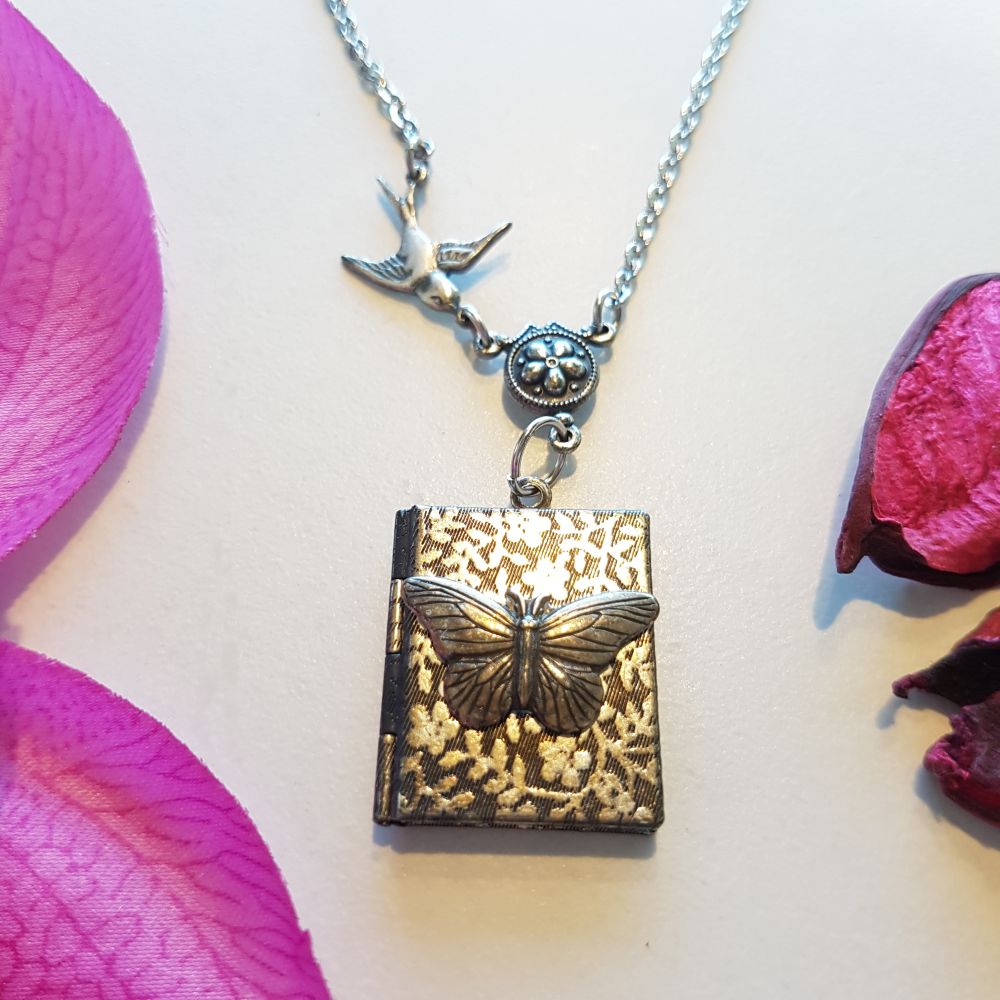 قلادة على شكل كتاب مزخرفة بنقش مميز ومطلية بالفضة المعتقة. بداخل القلادة مساحة مخصصة لإضافة صورتين من صورك المفضلة. تصلح كهدية لمختلف المناسبات المميزة.